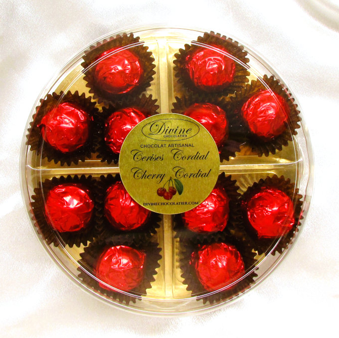 Assortment of 12 luscious & rich Cherry Cordial in Dark 72% chocolate.