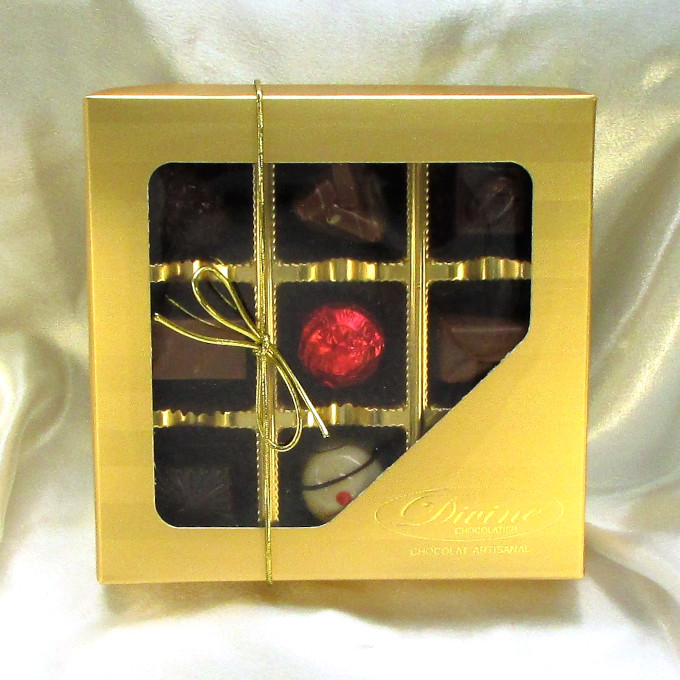 Divine Assortment - 9 pieces Référence: SQ-GOLD-9 $35.00Approx. 25.00 USDBest and most popular selection. Exotic, rich, simply Divine. Enter Quantity When there is a need for a special request, please contact us.Note: selection of chocolates may be different than the image